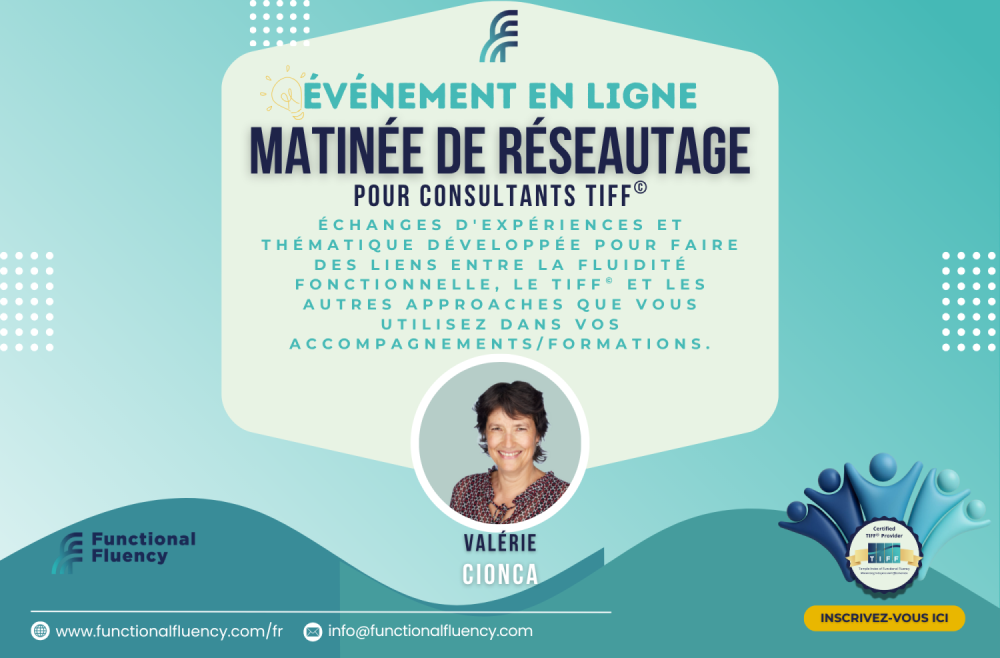 Rejoignez-nous pour une matinée d'échanges entre consultants TIFF avec un thème spécifique. Nous passerons en revue vos expériences avec la Fluidité Fonctionnelle et le TIFF lors des 12 derniers mois en tenant compte des contextes variés. Merci de compléter le formulaire comme base de discussion en listant vos besoins et intérêts. Ainsi nous pourrons faire des liens entre votre pratique avec la Fluidité Fonctionnelle ou le TIFF et d'autres approches que vous utilisez dans vos accompagnements (coaching, conseil, thérapie, ...) et formations.