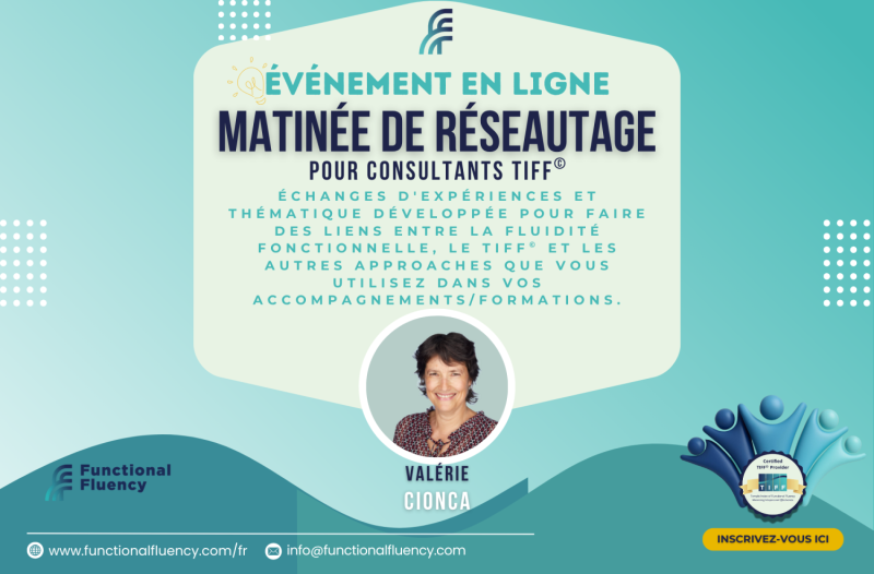 Rejoignez-nous pour une matinée d'échanges entre consultants TIFF avec un thème spécifique. Nous passerons en revue vos expériences avec la Fluidité Fonctionnelle et le TIFF lors des 12 derniers mois en tenant compte des contextes variés. Merci de compléter le formulaire comme base de discussion en listant vos besoins et intérêts. Ainsi nous pourrons faire des liens entre votre pratique avec la Fluidité Fonctionnelle ou le TIFF et d'autres approches que vous utilisez dans vos accompagnements (coaching, conseil, thérapie, ...) et formations.