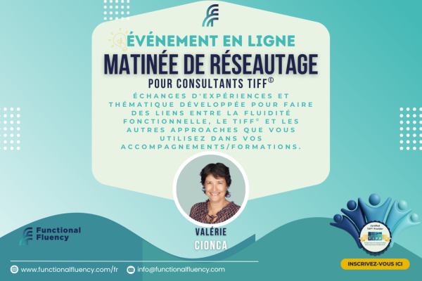 Functional Fluency International propose divers événements pour mettre en relation les gens, inspirer, développer et partager des idées sur le travail avec la Fluidité Fonctionnelle. Il s'agit notamment de supervisions (pour les consultants TIFF, afin de réfléchir à leur pratique), des sessions de réseau (pour les consultants TIFF, afin de se connecter les uns aux autres, d'apprendre et de développer ensemble des sujets spécifiques), des webinaires (pour tous, afin d'obtenir des informations de la part d'experts et d'interagir autour de ces sujets), des sessions Va sur le Tapis (pour tous, afin de s'immerger dans le modèle de Fluidité Fonctionnelle et d'aider à l'auto-réflexion), et des programmes de formation (pour apprendre et être certifié).