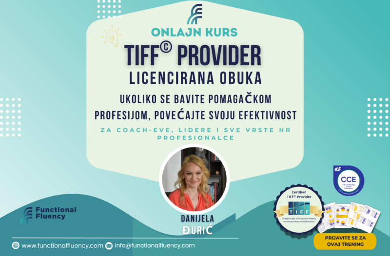 Ova osmodnevna, poludnevna TIFF© Provider licencna obuka (TPLT) je namenjena profesionalcima koji žele da poboljšaju svoju efikasnost sa svojim klijentima ili timovima. Ovaj ICF CCE akreditovani (40 CCE jedinica) iskustveni kurs traje približno tri meseca i održava se onlajn od strane trenera Danijele Đurić (master kliničke psihologije, sertifikovani transakcioni analitičar, trener i supervizor PTSTA-O).