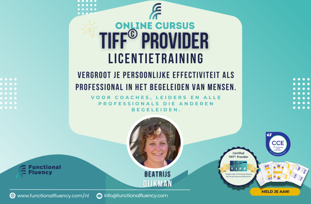 Wil je als coach, professionele begeleider of therapeut je vaardigheden uitbreiden en diepgaande integratie van Functional Fluency en TIFF© bereiken? Dan is onze uitgebreide TIFF© Provider Licentietraining precies wat je zoekt! Deze training is ontworpen om professionals te voorzien van een krachtige toolkit om mensen met wie zij werken nog effectiever te ondersteunen in zowel hun persoonlijke als professionele groei.