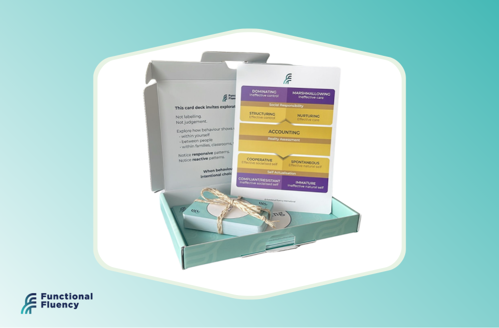 The Functional Fluency Card Deck© is designed to support individuals, teams and professionals to explore how behaviour shows up in everyday situations.